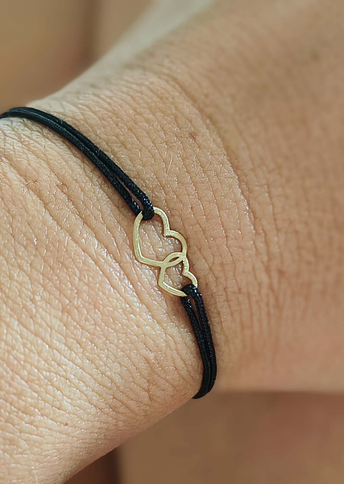 Adaugă un strop de eleganță și semnificație ținutelor tale cu această brățară fină cu șnur reglabil, decorată cu două inimioare delicate din aur galben de 14K. Simbol al iubirii, al conexiunii și al afecțiunii, cele două inimi întrepătrunse fac din această bijuterie un cadou ideal pentru persoana iubită, o prietenă specială sau chiar pentru tine.
