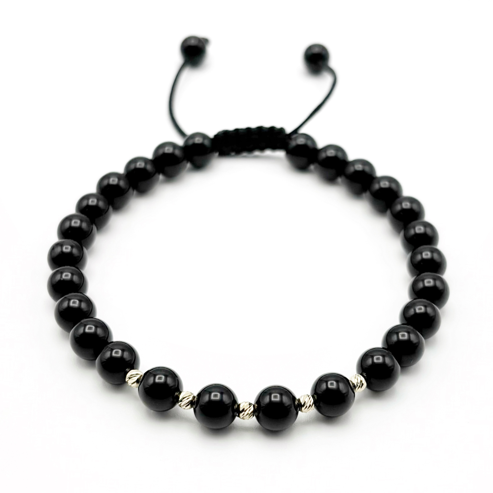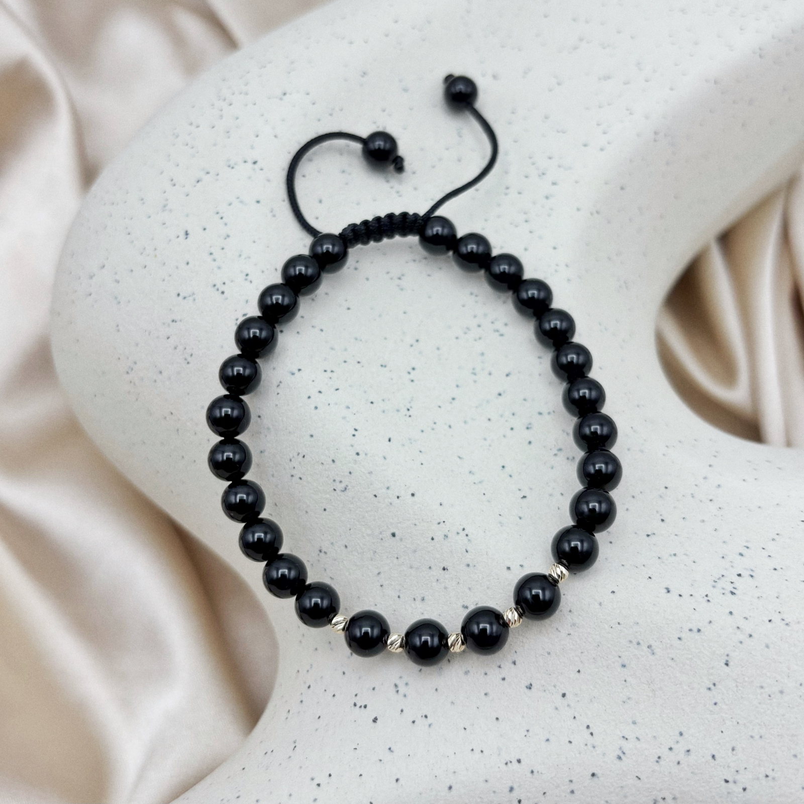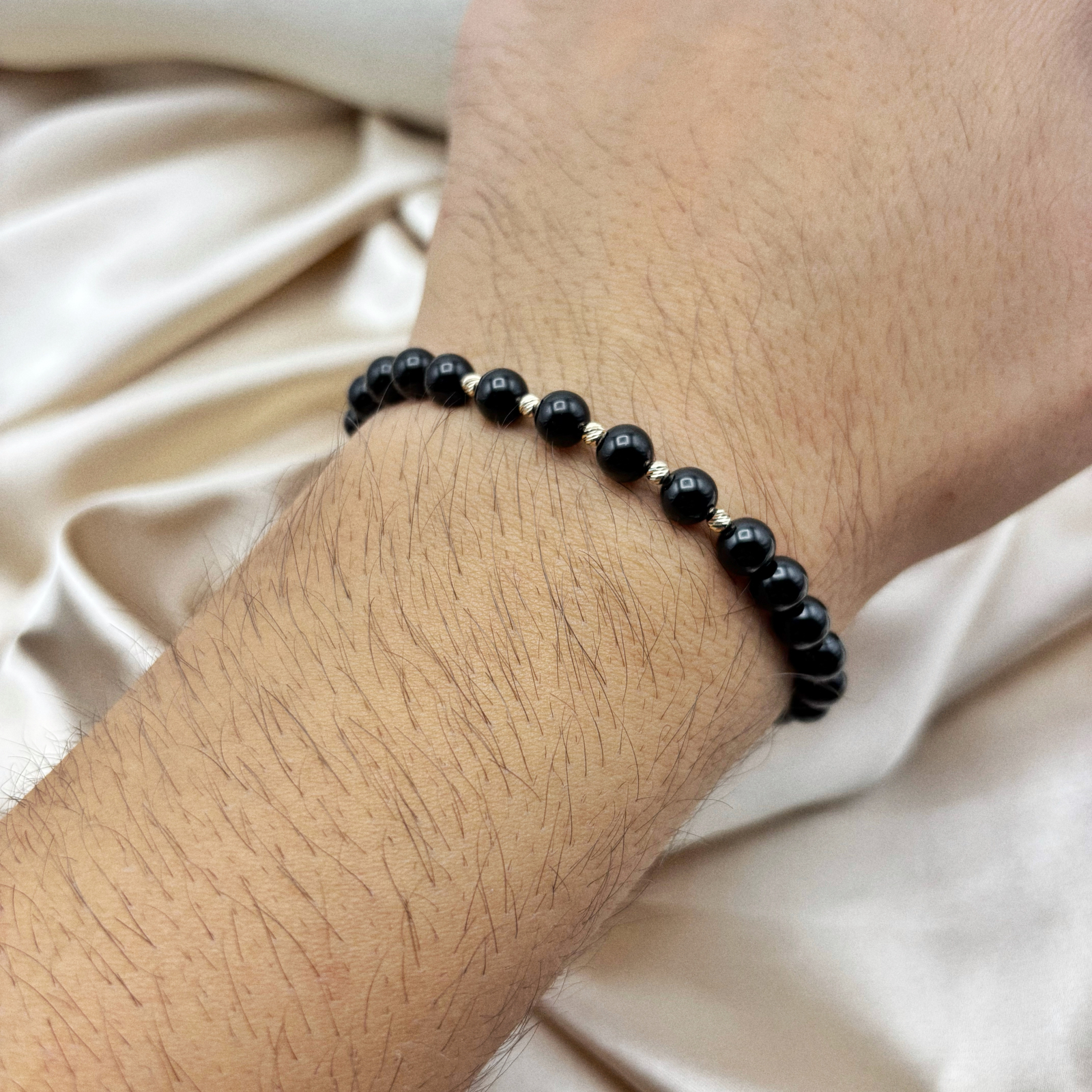 Descoperă o brățară de lux, realizată manual în atelierul BIJUTERIA NEAGRĂ, unde designul minimalist se îmbină cu simbolismul profund al pietrelor naturale. Confecționată din pietre naturale de onix negru lucios de 6 mm și 5 biluțe autentice din aur 14K de 2.5 mm, această brățară reprezintă un accesoriu premium, plin de rafinament, energie și stil.