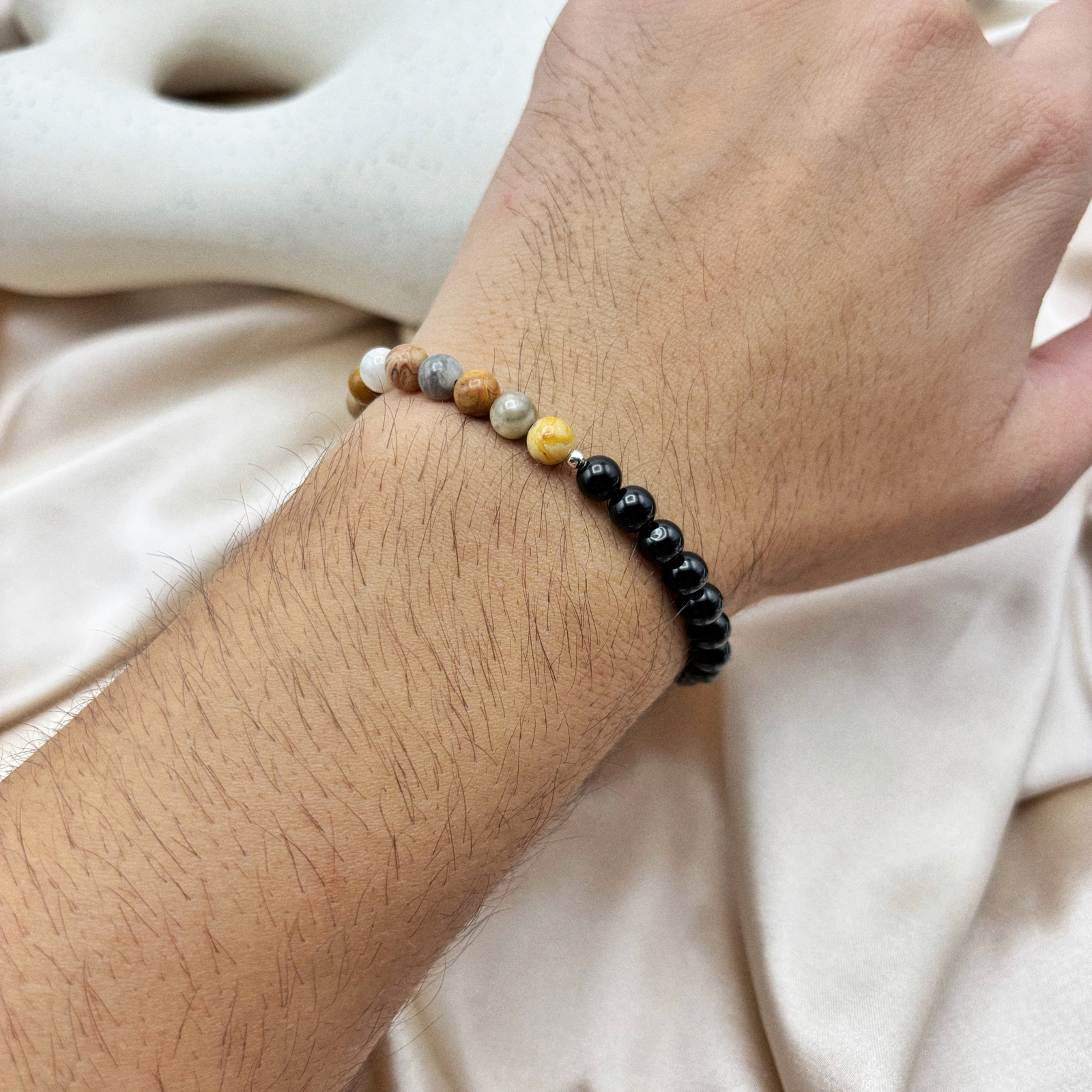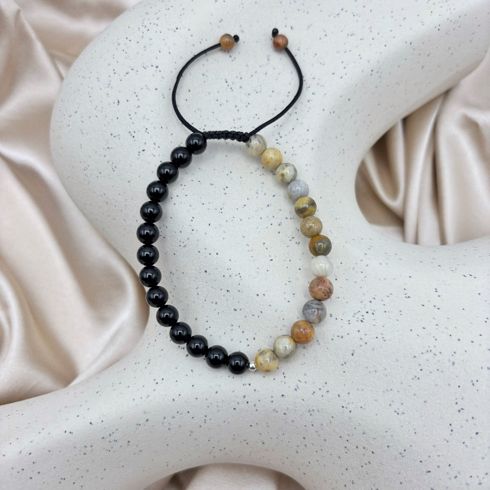 Adaugă un plus de stil și vibrație pozitivă ținutelor tale cu această brățară exclusivistă, realizată manual în atelierul Bijuteria Neagră. Combinația rafinată dintre Onixul negru lucios și Agatul Crazy Lace creează un contrast spectaculos, plin de personalitate și energie. Fiecare piatră naturală de 6 mm este atent aleasă, iar designul este finisat cu o biluță delicată din argint 925 (2,5 mm) pentru un accent elegant și premium.