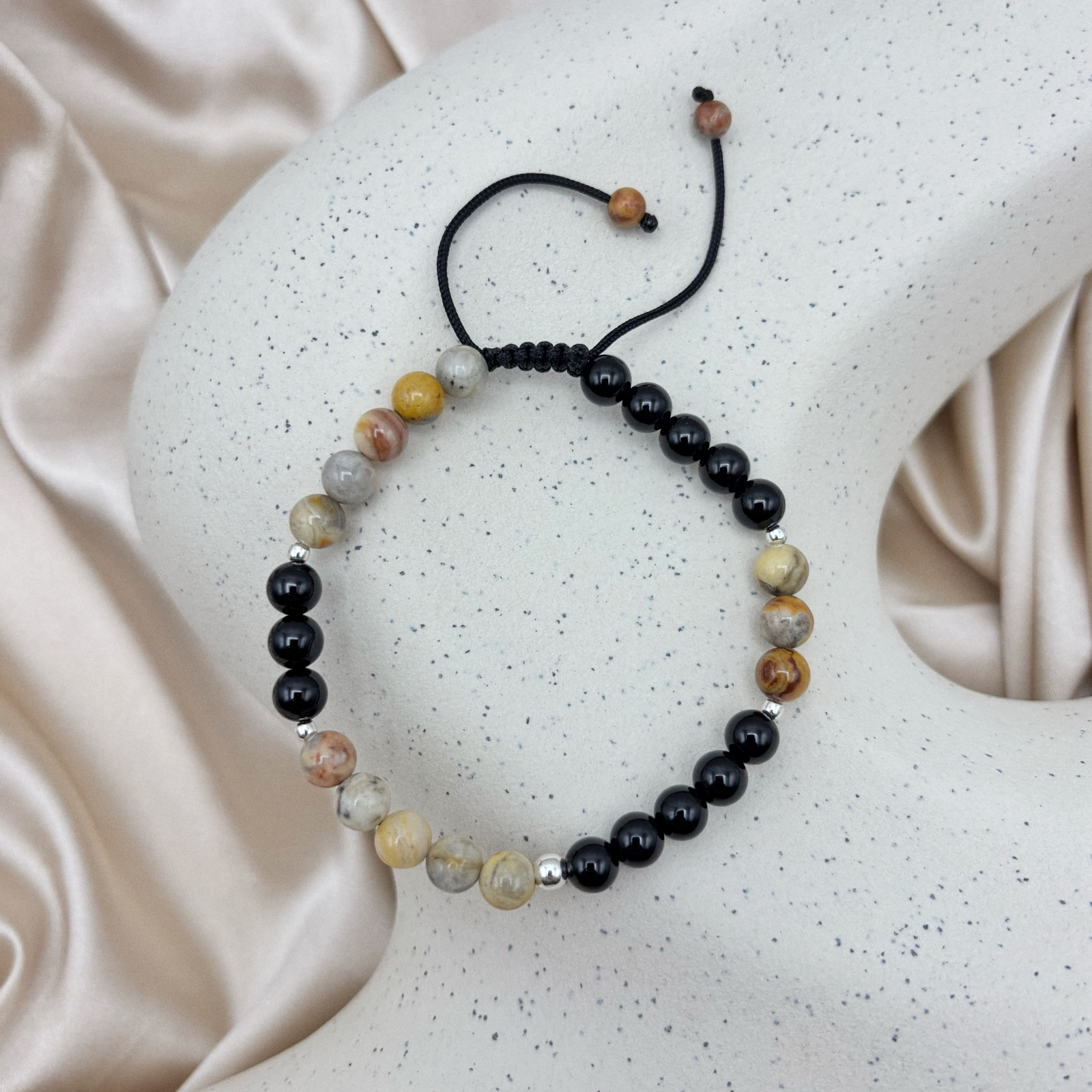 Fiecare piatră este unică prin nuanțele sale naturale – crem, maro, gri, ruginiu și bej – făcând fiecare brățară o piesă distinctivă.
