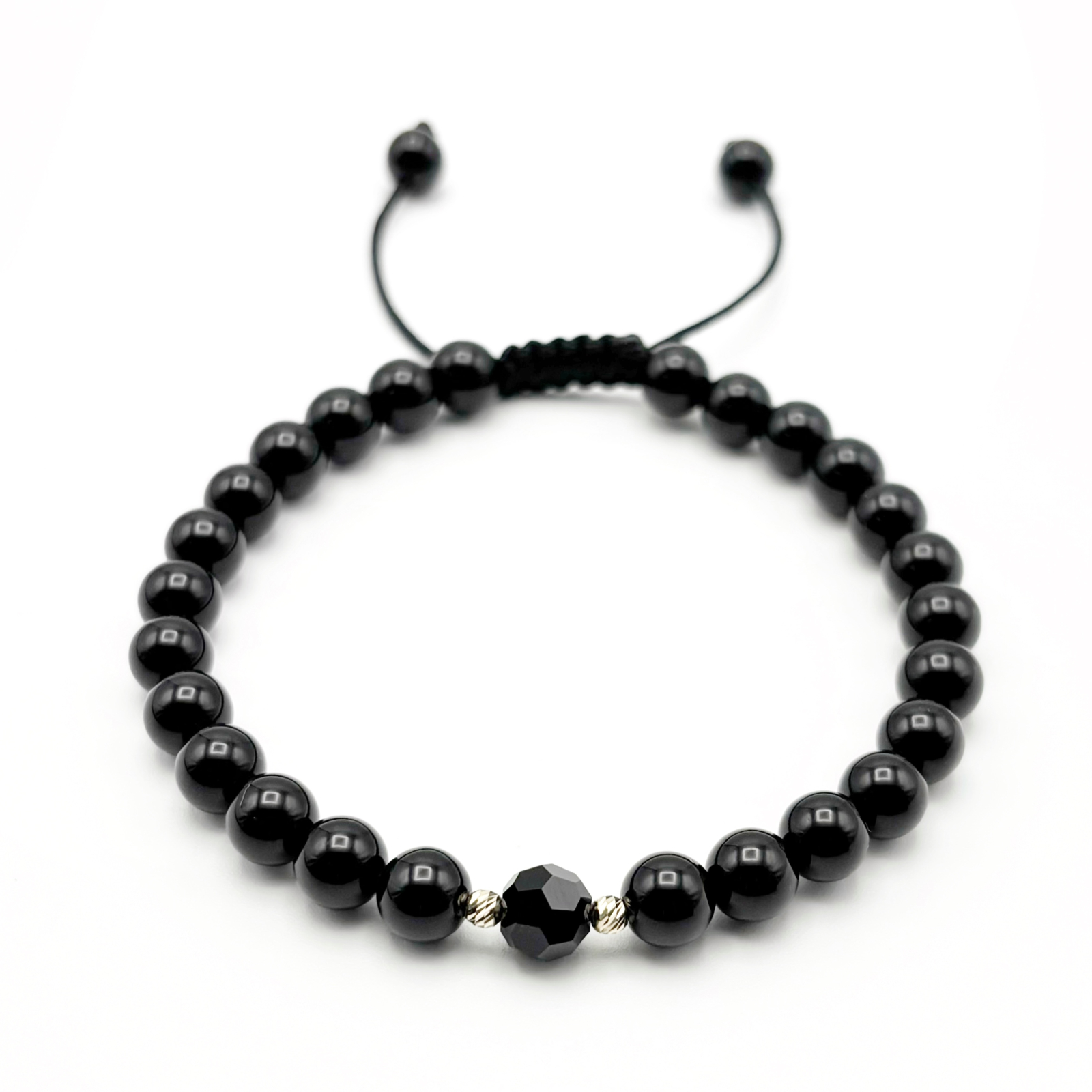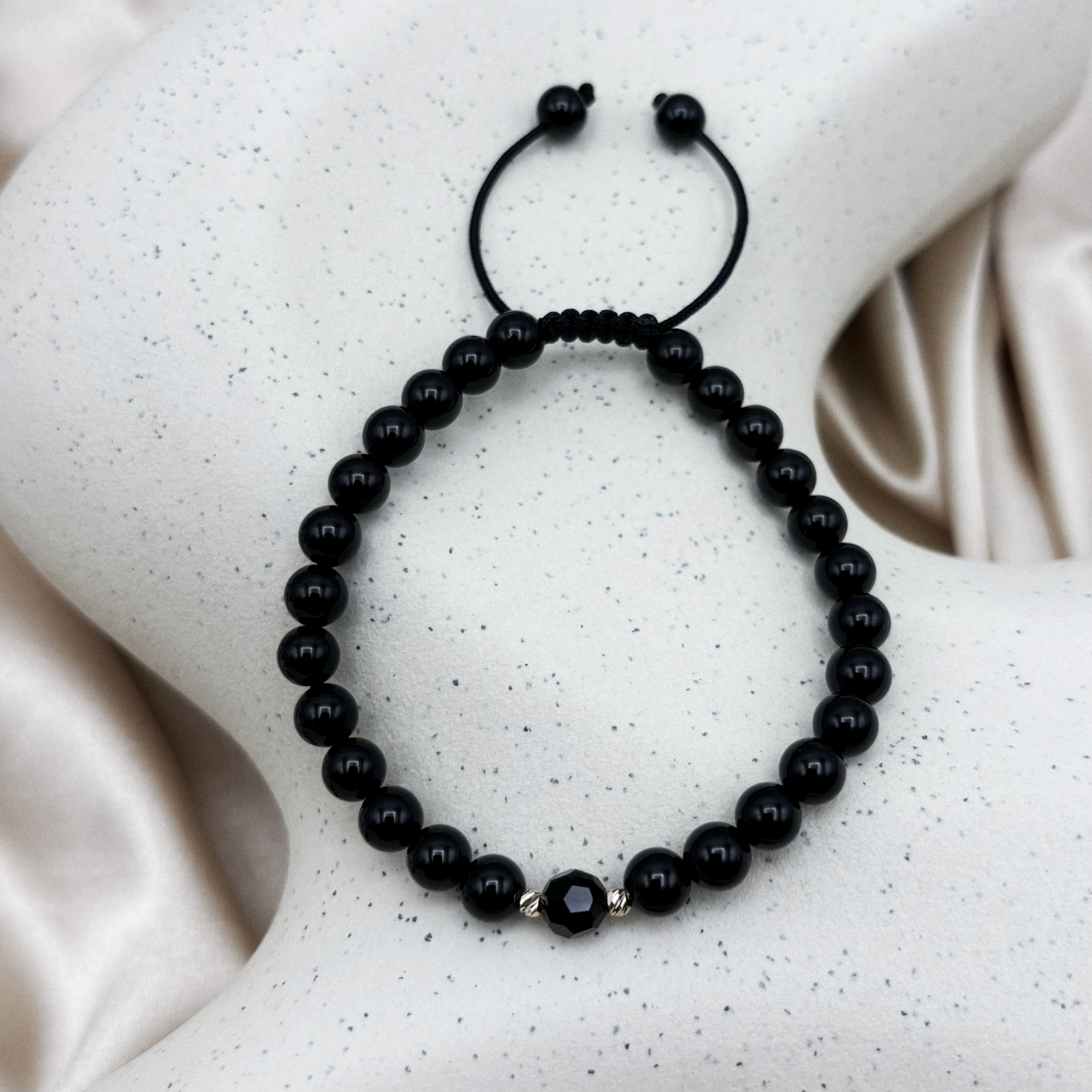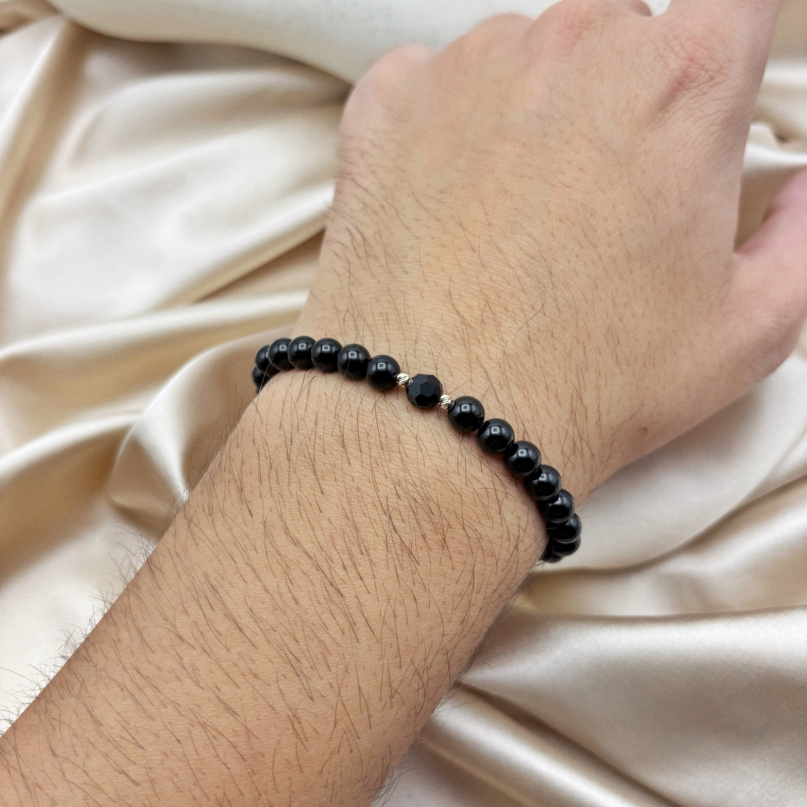 Adaugă un plus de rafinament look-ului tău cu această brățară handmade, realizată cu pietre naturale de Onix Negru (6 mm), un Cristal Preciosa negru premium și două biluțe fine din aur 14K (2,5 mm).