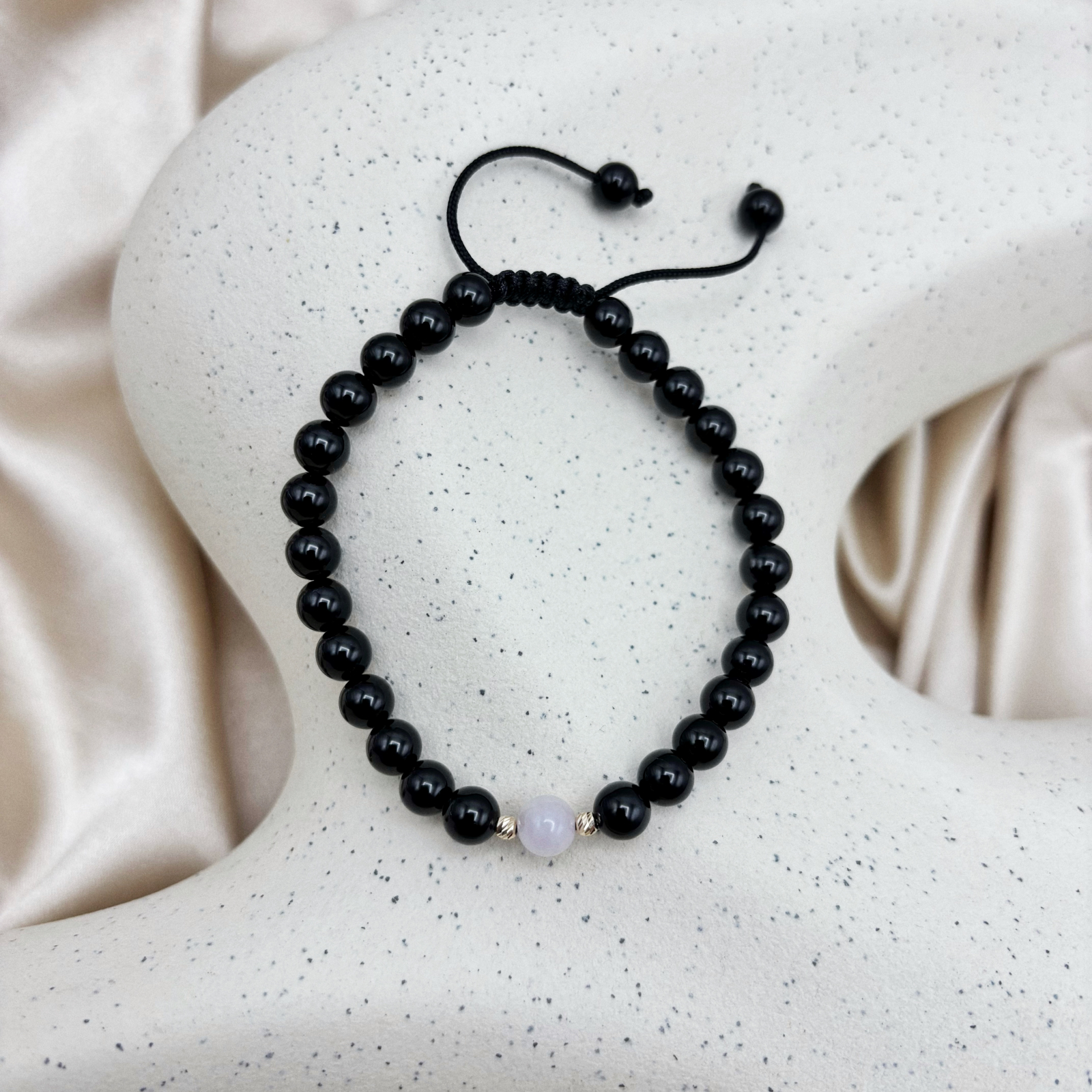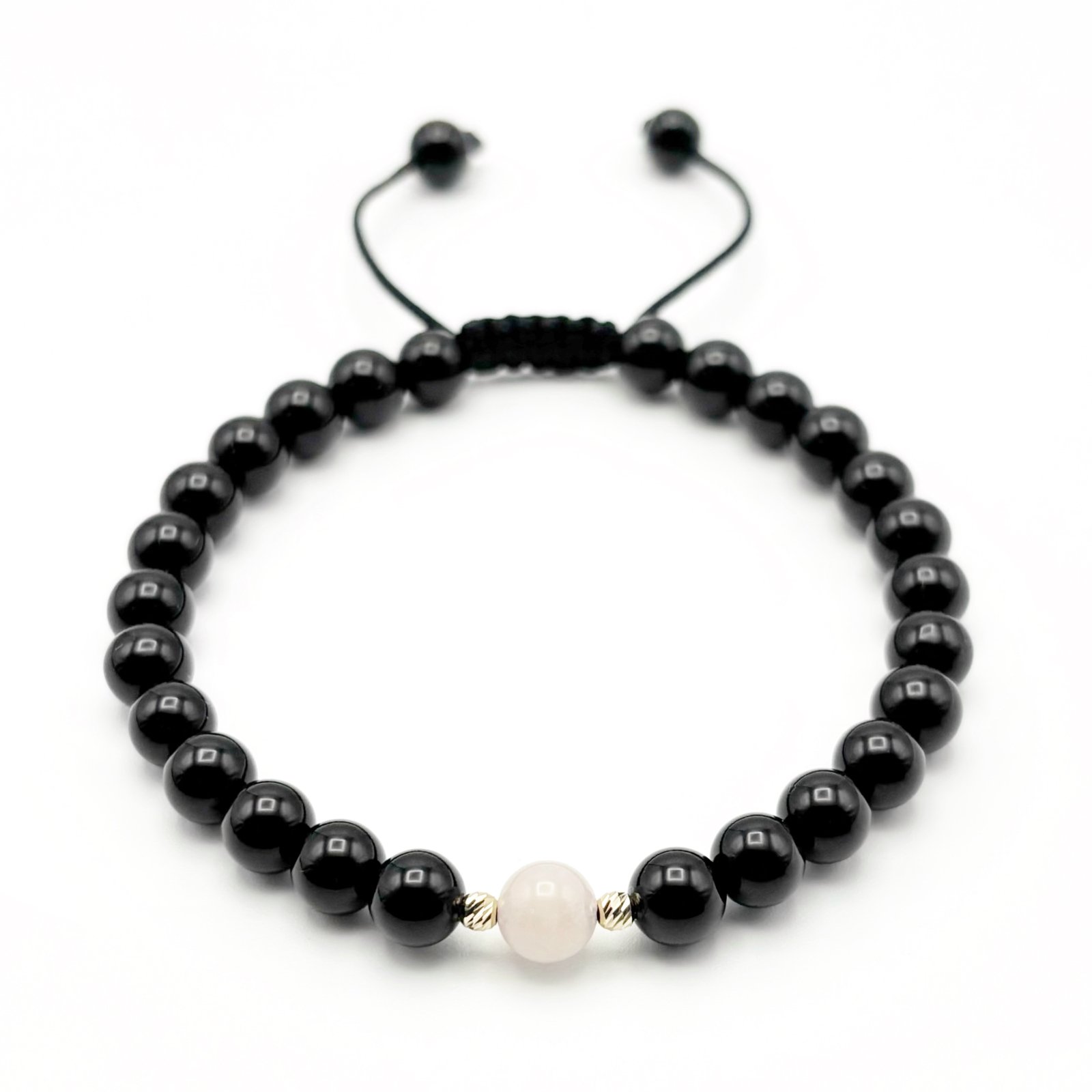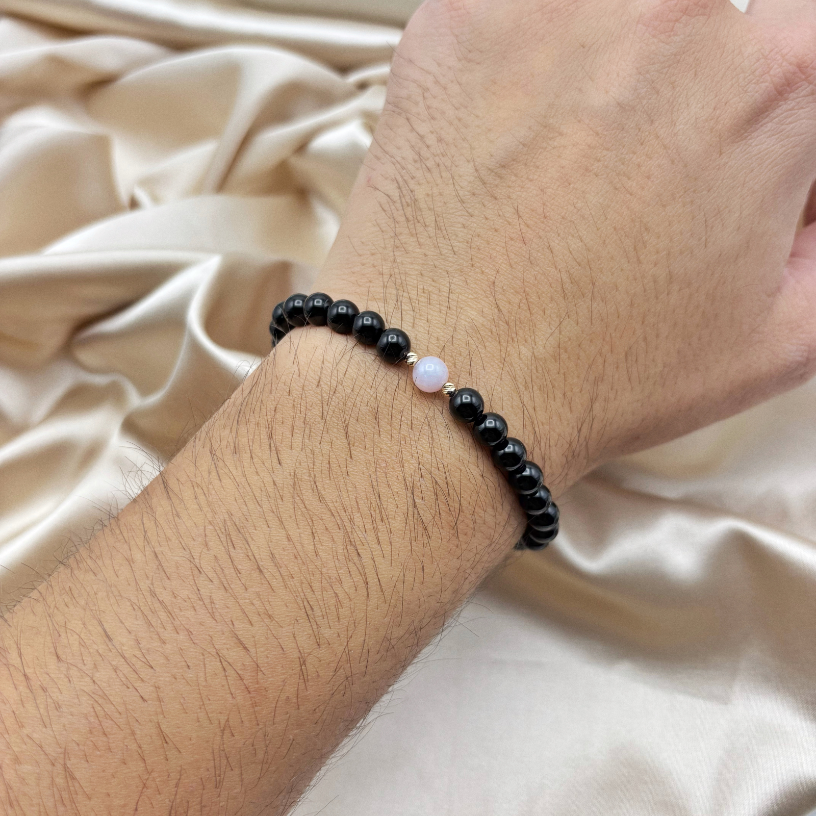 Adaugă un plus de rafinament look-ului tău cu această brățară handmade, realizată cu pietre naturale de Onix Negru (6 mm), Cuarț Roz și două biluțe fine din aur 14K (2,5 mm).