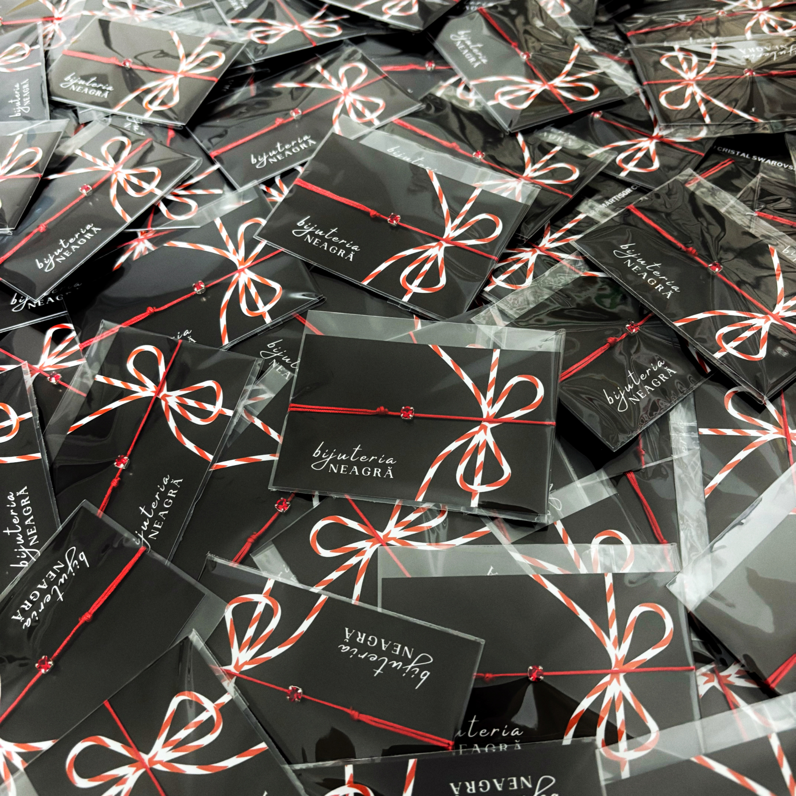 Fiecare brățară vine așezată pe un cartonaș personalizat BIJUTERIA NEAGRĂ, cu șnur alb-roșu imprimat, și ambalată individual în plic din folie transparentă, gata de oferit în luna Mărțișorului.