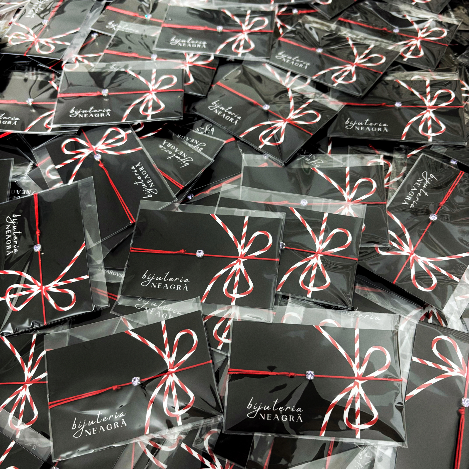 Brățările sunt livrate individual, fiecare fiind așezată pe cartonaș personalizat BIJUTERIA NEAGRĂ, cu șnur alb-roșu imprimat și ambalată într-un plic elegant din folie transparentă — gata pentru a fi oferită.