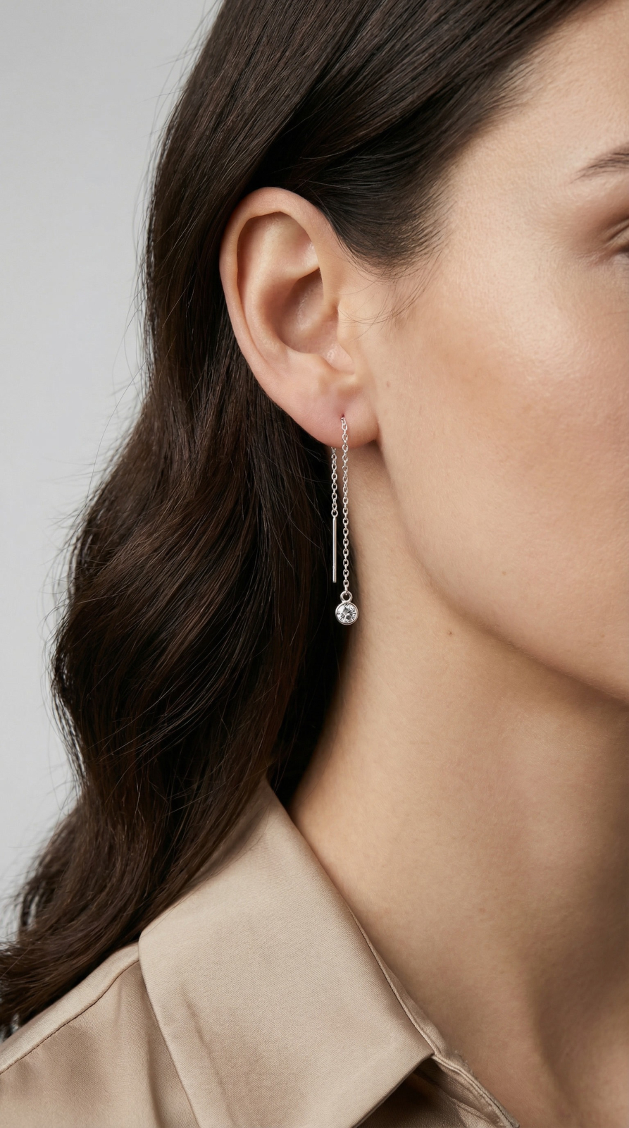 Eleganți și moderni, acești cercei lungi din argint 925 sunt alegerea perfectă pentru un look delicat, dar sofisticat. Designul tip threader (cu lanț fin care trece prin ureche) oferă un efect fluid și feminin, evidențiind subtil linia gâtului și adăugând un plus de rafinament oricărei ținute.