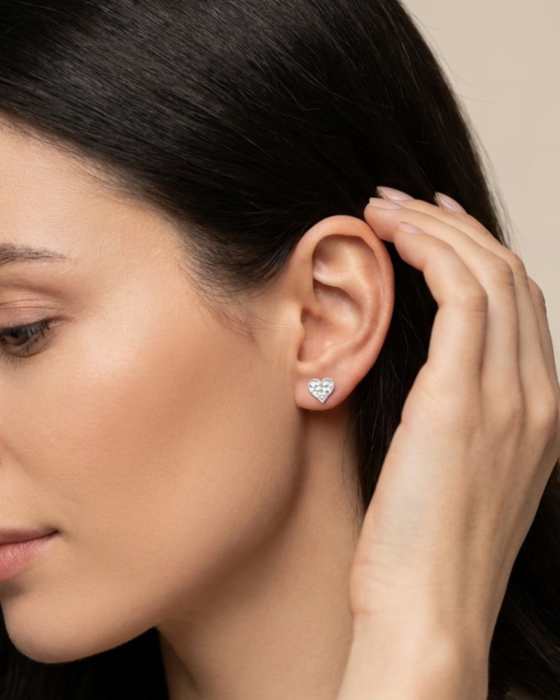 Textura delicată a inimioarelor reflectă ușor lumina, oferind un efect elegant și modern. Finisajul argintului evidențiază detaliile, păstrând un aspect curat și rafinat, ușor de integrat în orice stil vestimentar.
