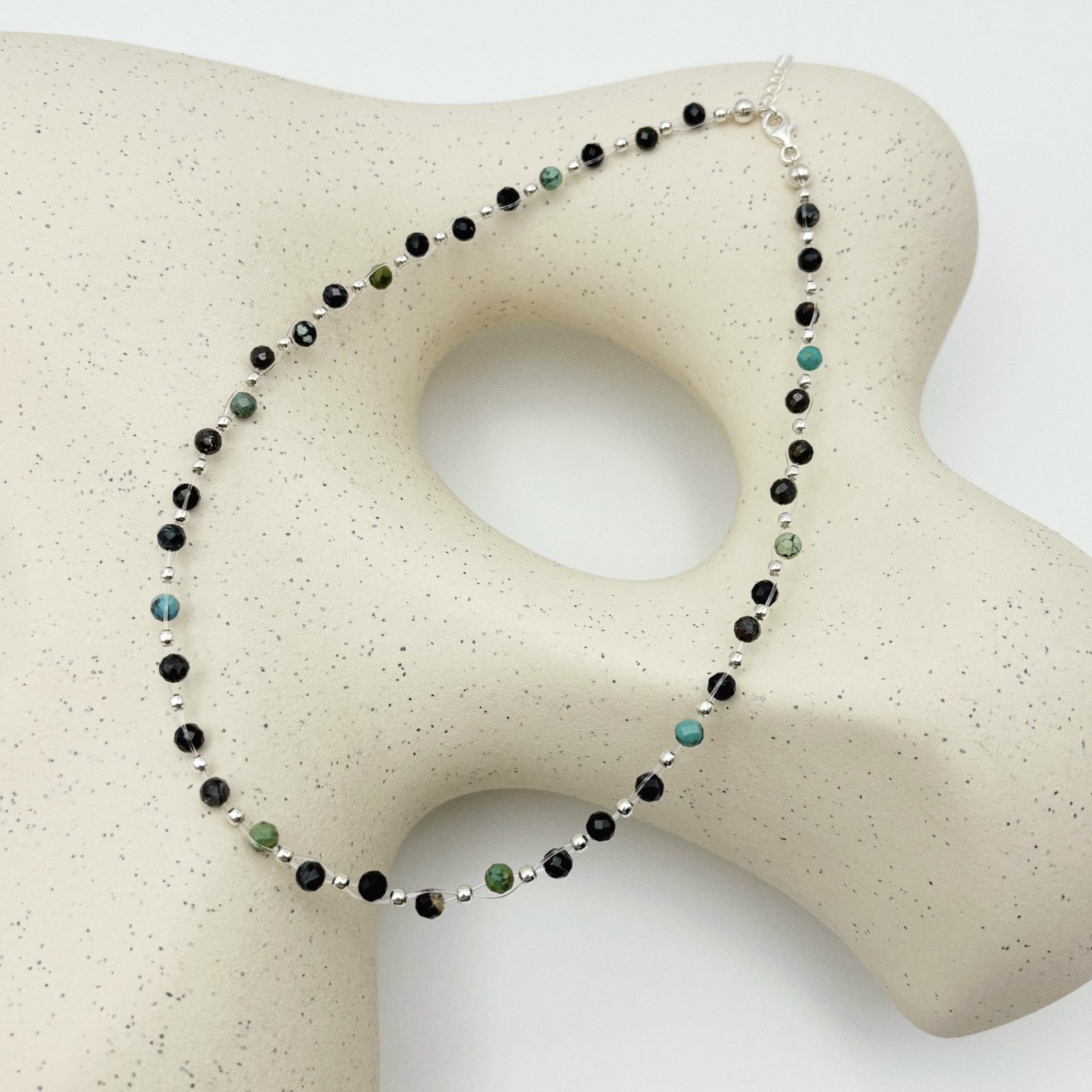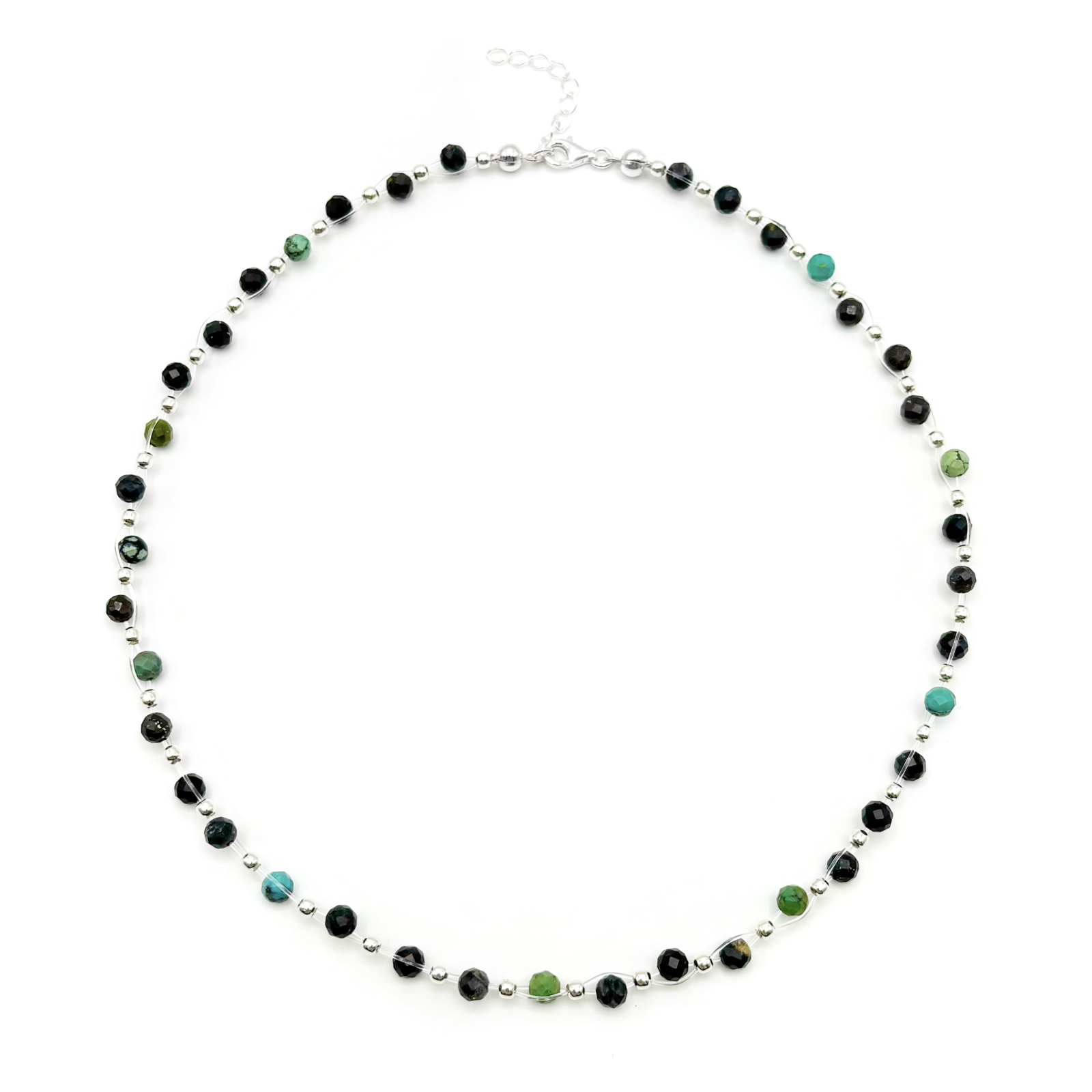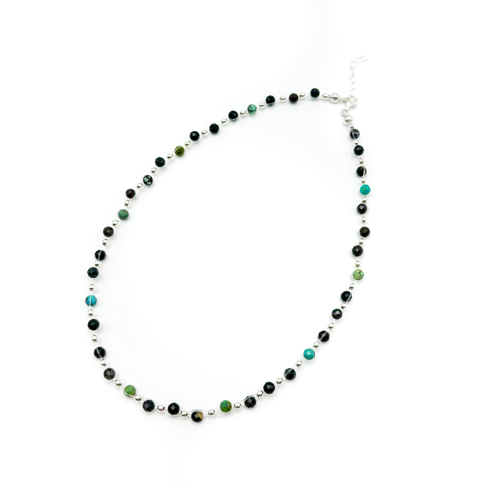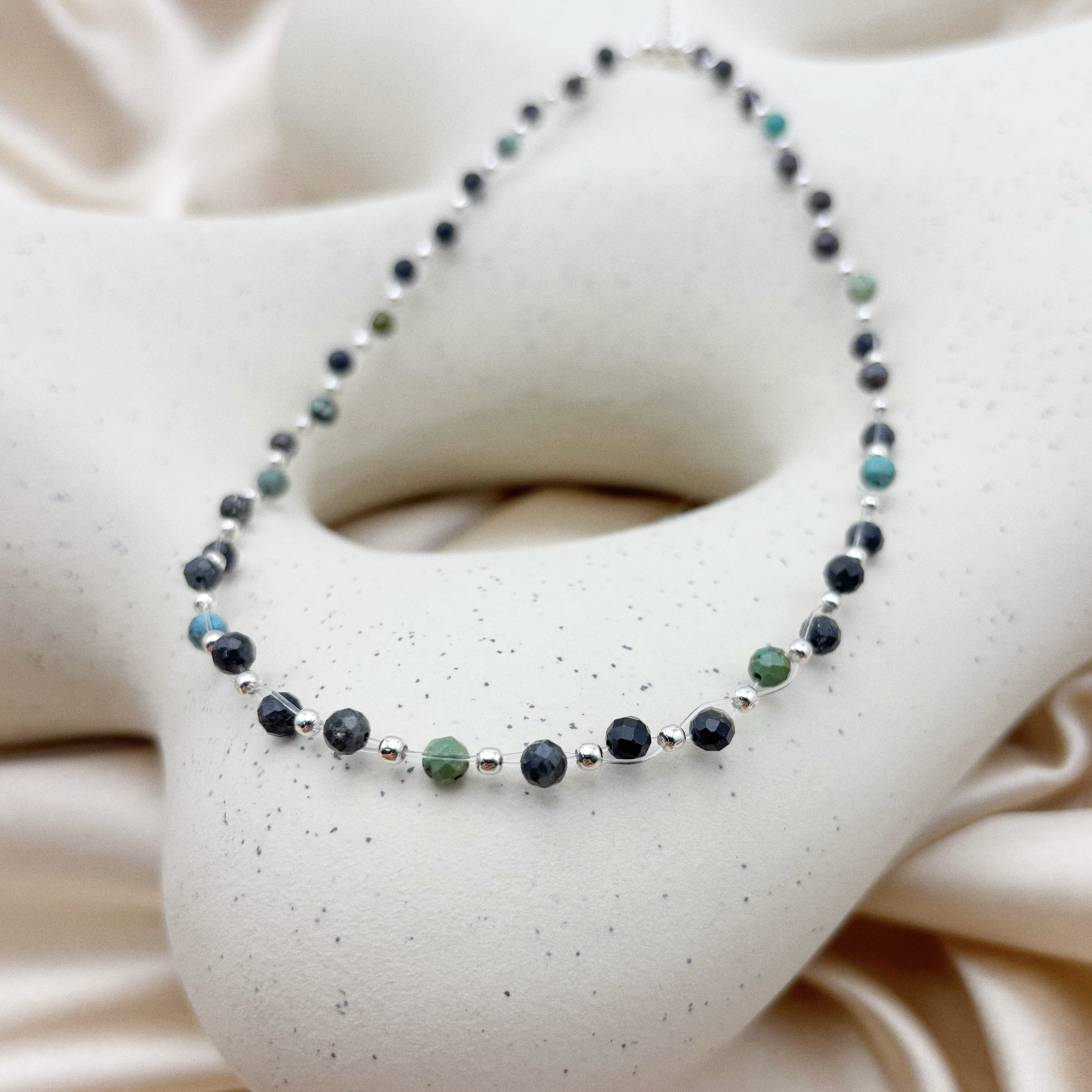 Un colier ce surprinde esența stilului modern: natural, sofisticat și plin de personalitate. Realizat manual în atelierul nostru, acest colier este creat cu pietre semiprețioase Turcoaz African fațetate și accesorii din argint 925, atent finisate pentru un look fresh, elegant și actual.